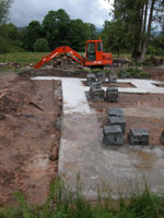 After a lot of faffing about (technical term for checking everything twenty times) we commenced pouring concrete on 4th July finishing it off on 5th. Ali Thomson returned to help, with Ali Sloan on digger duty and Robin and Andrew joining in with the hectic bits.