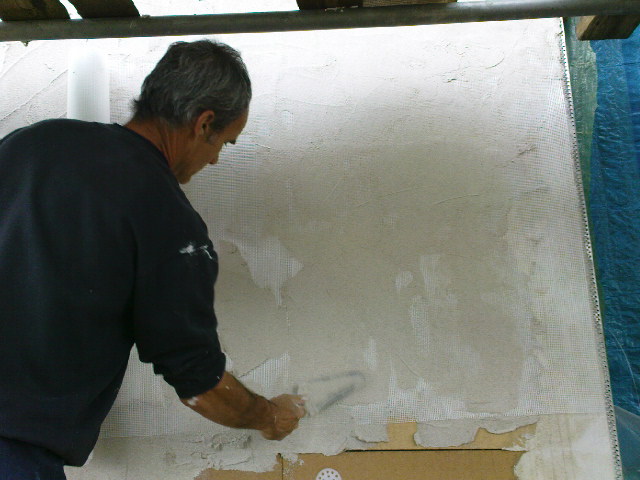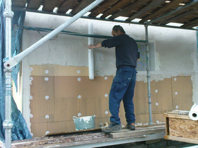 We were worried that we might not have time to finish the cladding and rendering before we would have to move the scaffolding for him at the weekend. But the rain kept him away and on the Friday, which was fine, his car broke down. We leant him our land rover so that he could keep going but by the time he’d got his back on the road we’d managed to finish the cladding and basecoat render . Phew!