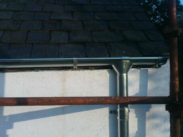 The stainless steel gutters and down pipes arrived today and we got the first one up to protect the render from the dust and chalk coming off the roof when it rains. John is just off to see if it works because as you might have guessed, it’s pelting down – again.