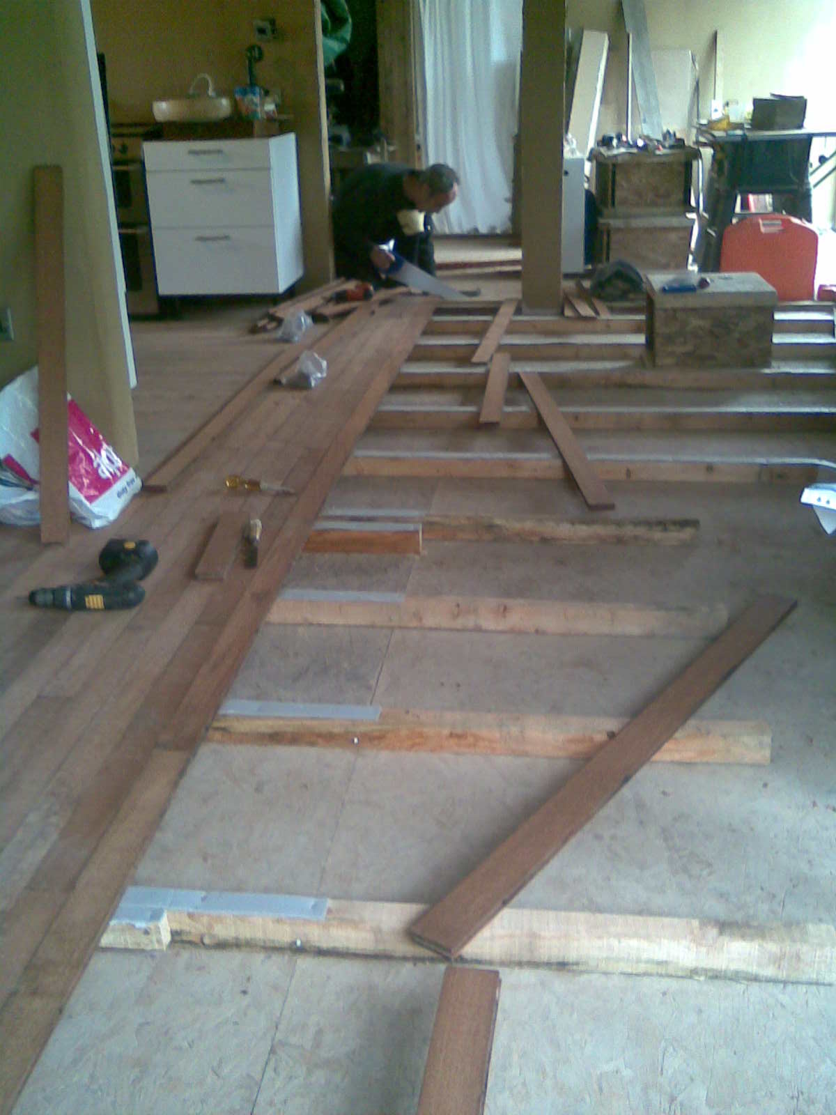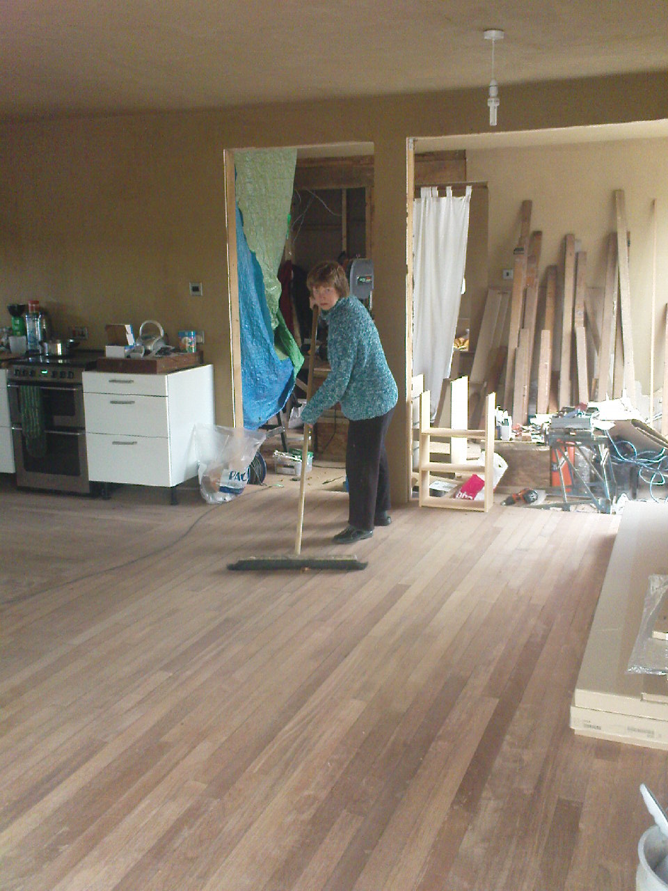 as we reached the end of the kitchen wall. Rather than a big adjustment we ‘eased’ it through a few rows. It has gone in nicely level at the big doors. Now we need to seal it and have ordered oil and wax for a thorough job.