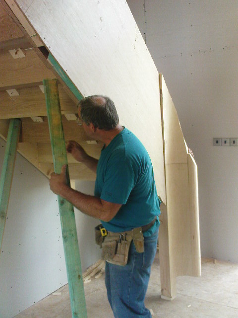 After much planning and imagining and discussing and calculating, we finally took a flying leap and entrusted the stair design to John Dement of Handmade Stairs. He took out the top bend so that the stair lands facing the big window at the back and added an extra riser. He and Frank were here for 3 days fitting the stair and building the enclosed balustrade and the rolled handrail.