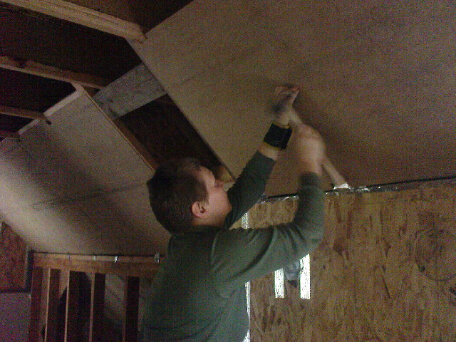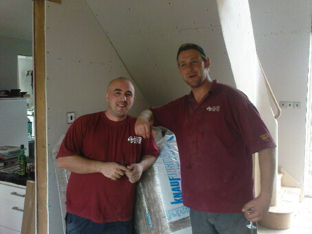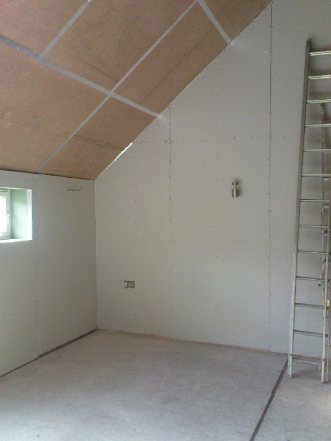 The next big push was to get the wiring in the ceilings so that we could fit the hardboard and get Clyde Insulation back to complete the installation of warmcell in the roof. It was a bit of a slog – we kept having to move piles of hardboard, or piles of wood, or sheets of plasterboard, or scaffolding, or ladders. After a couple of days sofa and curtain hunting in Glasgow and another day away kayaking, it took a few late nights to get it all done and taped. The lads arrived at about 10.30 but it took them a while to get organised with the drills and hoses and so on, so we just made it.