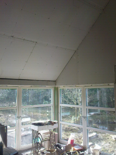 dsc01526.JPGThe main job has been plasterboarding upstairs and that seems to have taken forever. Getting at the huge ceilings is requiring a lot of lateral thinking, not to mention hop-ups and scaffolding and we set ourselves another little target of getting it all up before we went to Neil and Dorothy’s silver wedding in York. The proper clay plaster has been used in the bathroom where it will be of use in moderating the humidity and the hall will use of the last of it. The rest will be done in ordinary gypsum plaster as the clay is so expensive to buy and ship here. We have reassured ourselves that the benefits are marginal in non wet areas and the stuff is made from recycled material and not too toxic. As Ian is no longer plastering, we have had to find another plasterer to do the bedroom, stairwell and landing.