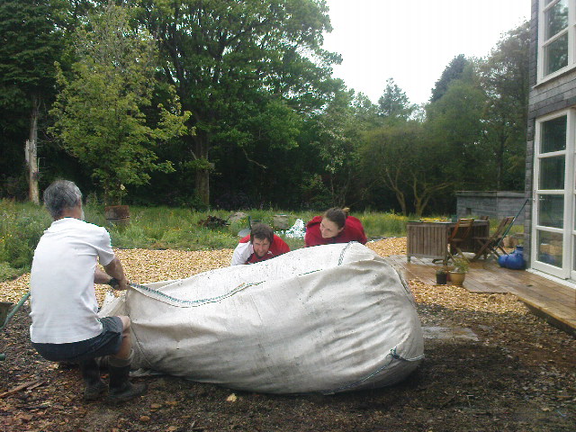 Then we used up the remaining bags of woodchip where we had enough terram. It makes a huge difference to the view from the living room and we can almost imagine what it will be like with the barn away and the rest of the area tidied up. But if we put any more woodchip down, John is going to start neighing and insist on building fences and hedges to jump over.
