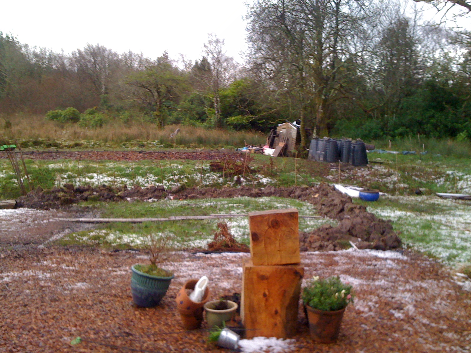 The other benefit of forming the additional carparking was that it created material that we have used to give the back garden a bit of “structure” as Hamish put it. Basically, the garden is too flat and we need some raised beds to give it a bit of shape and interest. The lack of daylight and the poor weather has hindered progress but the plan is to cultivate the mounds and hopefully, whatever we plant won’t simply drown in the soggy ground. We’ve also been collecting seaweed for the equally flat (well it would be having been a tennis court in a former life)vegetable garden and pebbles to go around the bases of the standing stones.