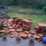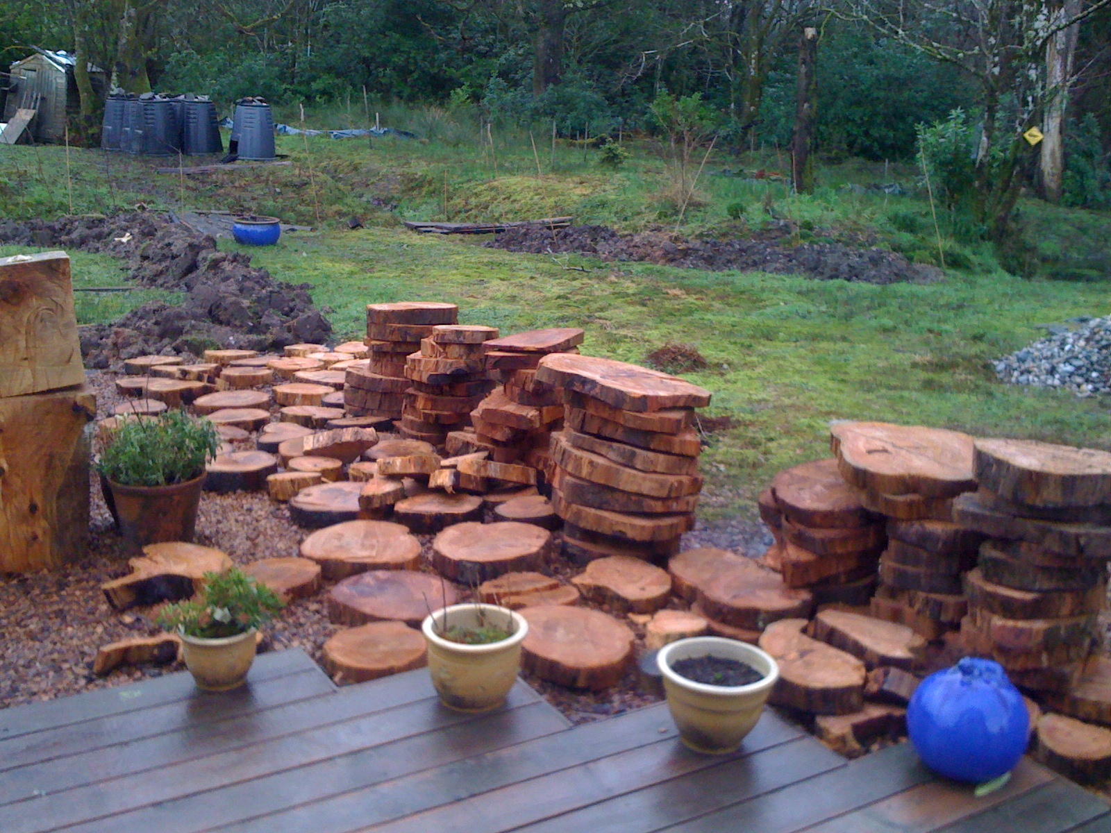 Scraping mud off the old driveway has been happening occasionally and we unearthed some large cedar trunks that had been buried under the slab wood which had been piled where we needed to make the drains. They were too big to move so had to be cut up in situ which wasn’t straightforward. The chainsaws didn’t like the mud on the trunks and were going blunt very quickly. Fortunately, Andrew Woodhouse had given me a special grinding wheel which I’d looked at previously but, without instructions, hadn’t fathomed out how to use. I got the hang of it during a particularly wet afternoon and was inspired to cut the logs into 50mm thick roundels which we’ll use as part of the garden paths. They’ll probably get a bit slippy but if they are too bad we can always burn them!