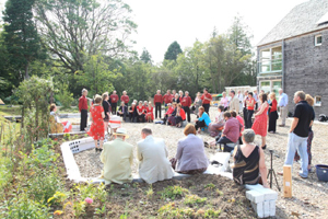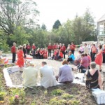 Our own Rubydo in August was great fun. If the weather good we had hoped to hold the main event in the garden in the afternoon, followed by some music and dancing in the Village Hall (conveniently located at the foot of the lane) and if the weather was bad, everything would be in the Hall. We struck lucky! We hired some help, made sure everyone was accommodated in local B&B’s, friends, floors or camping in the garden and crossed our fingers. We really appreciated seeing so many ‘old’ friends making an effort to come from far and wide. The campers enjoyed a fire pit and soft moss to sleep on. For some it was a chance to see the house that we have been rabbiting on about for so long, for others it was a chance for a reunion and for others a chance for a party. Everyone was asked to wear something red which suited the Fynesiders (one of their outfits is a red shirt with white dickie) and to bring a memento which we could incorporate into a garden feature. John’s sister organised the ‘ceremony’ which consisted of John and me answering the questions How Did You Meet? – a version of Maurice Chevalier and Hermione Gingold’s I Remember it Well, What Attracted You to Each Other? – Suse read a song she wrote at the time and John said something that reiterated the sentiments of the first song and How Do You Think You Have Stayed Together? – Goodness knows, but we’re havin’ a party. Our Best Man had another go at his speech and a few others said what they thought of us (nothing too embarrassing!) Then a number of other people sang. There was a bit of mooching about as people chatted and made their way to the Hall where there was a slight delay while ‘they’ struggled to light the oven but the food seemed to go well and the music (Cabin Fever a local 60s/soul band) and Neil and Dorothy’s ceilidh calling was good fun. We got to bed at 3 and started breakfasts at 9!
