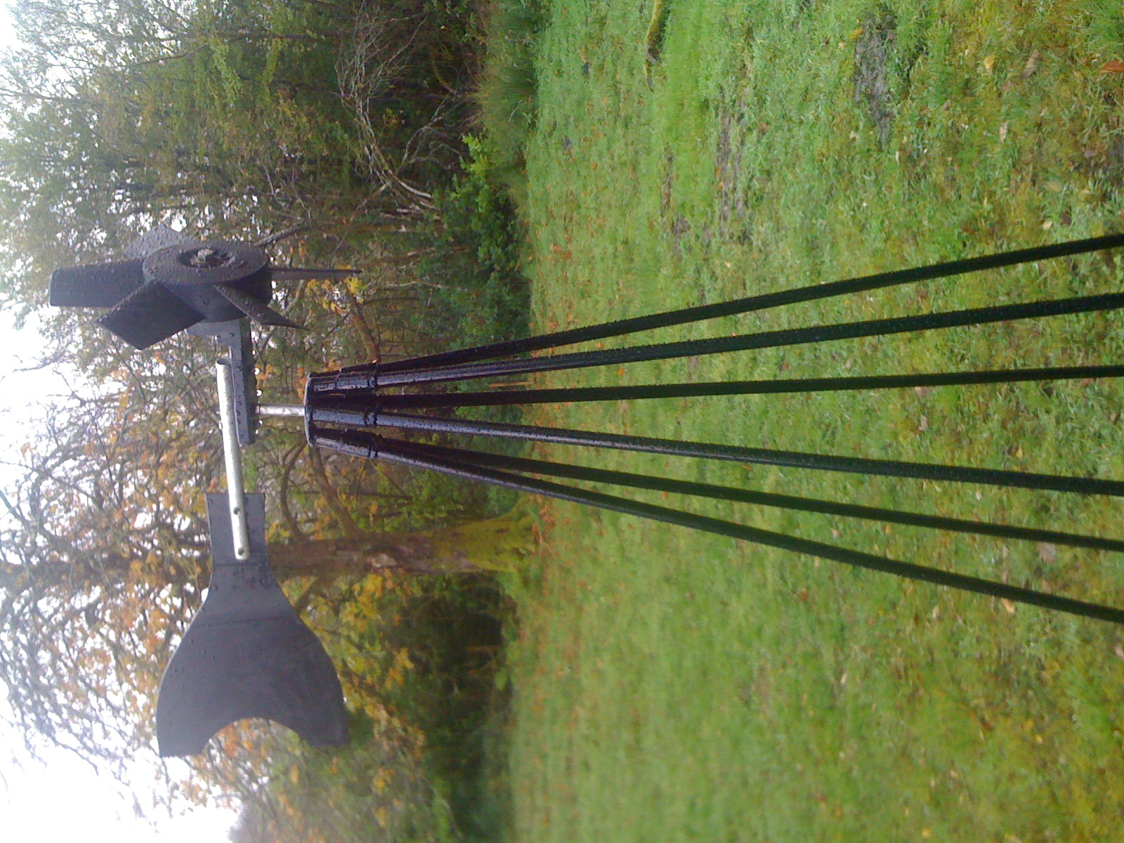 Finally, we have a new installation in the garden. It started out as a bean frame but became some kind of a weather vane. The frame is old electrical conduit; the propeller (from an old Fiesta) does spin but it needs a decent breeze to get it going. The back fin started life as a lorry mud flap.