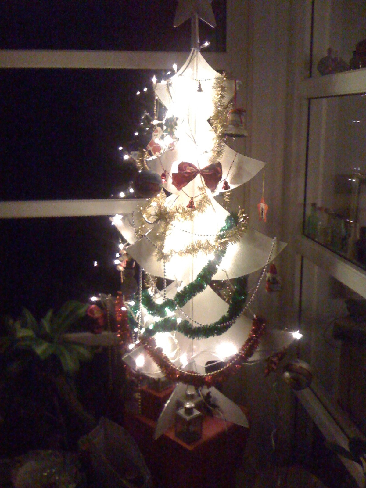 We thought about reverting to our usual Christmas tree rustling after last year’s flirtation with gnarly rhododendron. Then when we re-discovered some sheets of hardboard in Suse’s office, we decided to try some thing different again. When it comes down on Twelfth Night it may have holes cut into it so that the decorations can hang inside them (at least this is what IKEA did with theirs – copy cats!)