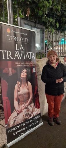 What a treat to wake up to the sunshine in Rome! The apartment was again in a very convenient location, though it had an odd layout and wasn’t that well set up. Anyway, it had an impressive main door into the courtyard. We rested in the afternoon as John has a cold and had mince and tatties for dinner, then ventured out to the opera and found the church easily. It was obviously a limited production but to my surprise John was very taken with it and we looked it up on youtube with a view to watching it with English subtitles later.