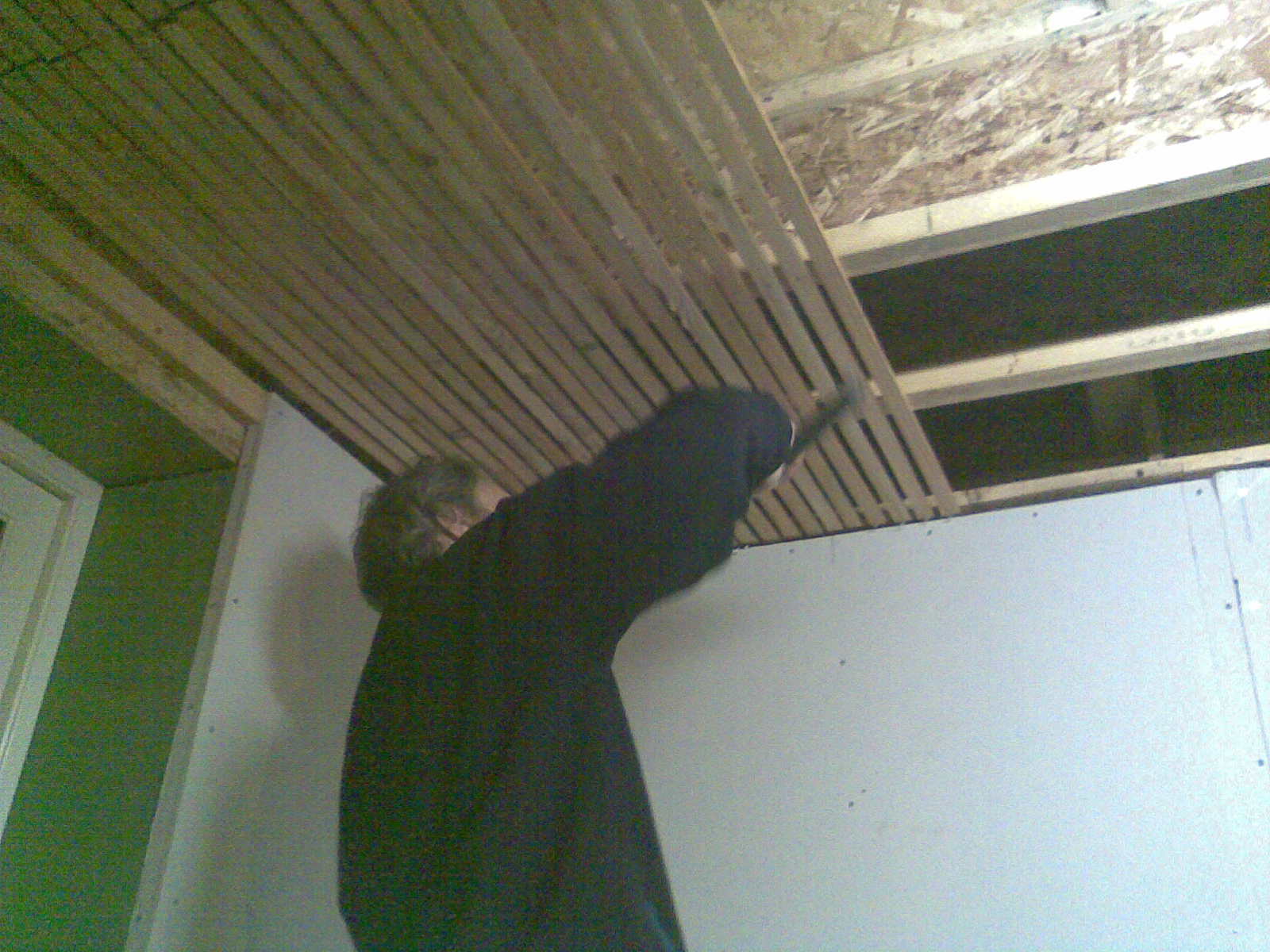 The first slatesAnother month. My the weeks are passing!  Everything seems to marking time but Mick has started slating and the first instalment of larch cladding has finally arrived. It is going on the wall very nicely. The diffutherm order, the insulated wall panels that will be rendered, turned up late and incomplete but we should be able to get cracking on that once the cladding is up.
